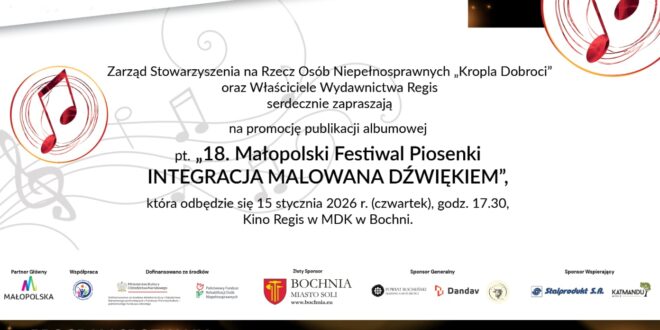 15 stycznia w Kinie Regis w Miejskim Domu Kultury w Bochni odbędzie się promocja albumu podsumowującego 18. edycję Małopolskiego Festiwalu Piosenki „Integracja malowana dźwiękiem”, jednego z najważniejszych wydarzeń muzycznych w regionie, które od lat łączy muzykę z ideą integracji społecznej.