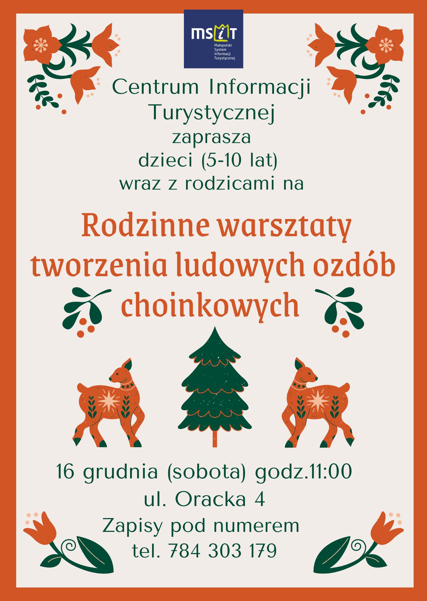 Centrum Informacji Turystycznej zaprasza w najbliższą sobotę 16 grudnia 2023 r. o godz. 11.00 na rodzinne warsztaty z tworzenia ludowych ozdób choinkowych.