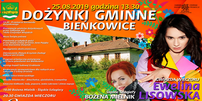 25 sierpnia br. w Gminie Drwinia w Bieńkowicach odbędą się dożynki na których gwiazdą wieczoru będzie Ewelina Lisowska.  Szczegółowy plan imprezy znajduje się na plakacie poniżej.
