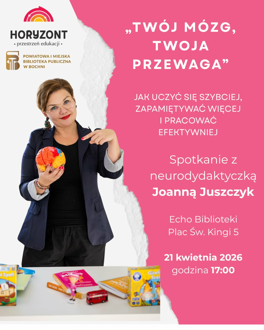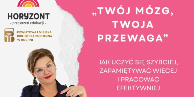 Powiatowa i Miejska Biblioteka Publiczna w Bochni zaprasza na spotkanie „Twój mózg – Twoja przewaga”, które poprowadzi Joanna Juszczyk, dnia 21 kwietnia 2026 roku, o godz. 17.00 w Echu Biblioteki (Plac Św. Kingi 5). Wstęp wolny!