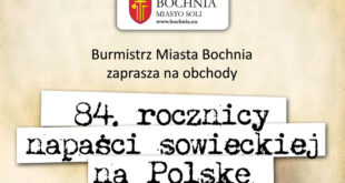 Burmistrz Miasta Bochnia zaprasza do wzięcia udziału w obchodach 84. rocznicy agresji sowieckiej na Polskę we wrześniu 1939 r. Uroczystość, połączona z modlitwą za poległych w obronie Ojczyzny, odbędzie się przy mogile żołnierzy Wojska Polskiego na cmentarzu św. Rozalii, w niedzielę, 17 września 2023 r. o godz. 9:00.