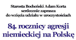 Starosta Bocheński Adam Korta zaprasza do wzięcia udziału w uroczystościach rocznicy agresji niemieckiej na Polskę i wybuchu II wojny światowej.