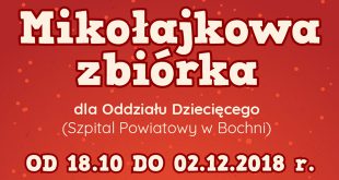 Zapraszamy wszystkich do wzięcia udziału w akcji od 18 października do 2 grudnia br. w której celem jest Mikołajkowa zbiórka dla maluchów z Oddziału Dziecięcego Szpitala Powiatowego w Bochni. Zbiórka odbywa się w szkole nr. 1 ul.Biała 2 w Bochni. W holu jest wystawione pudełko, gdzie można zostawić zakupione rzeczy dla małych pacjentów. Potrzebne są: zabawki – drewniane (nowe), zeszyty, ...