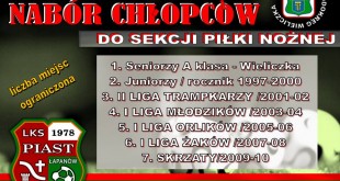 Piast Łapanów ogłasoł nabór do drużyny chłopców z sekcji piłki nożnej. Więcej informacji o szczegółach naboru można się dowiedzieć dzwoniąc na nr tel. 884 984 461.