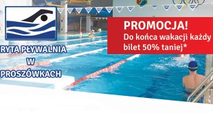 Kryta Pływalnia w Proszówkach zaprasza po przerwie technologicznej. Dla wszystkich zainteresowanych ofertą basenu przygotowano promocję bowiem do końca wakacji każdy bilet 50% taniej. Szczegóły znajdują się na poniższym plakacie.