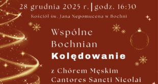 Burmistrz Miasta Bochnia Magdalena Łacna oraz Proboszcz Parafii św. Jana Nepomucena w Bochni ks. dr Daniel Bubula zapraszają serdecznie na „Wspólne Bochnian Kolędowanie” z udziałem Chóru Męskiego Cantores Sancti Nicolai, które odbędzie się w niedzielę, 28 grudnia 2025 r. o godz. 16:30.