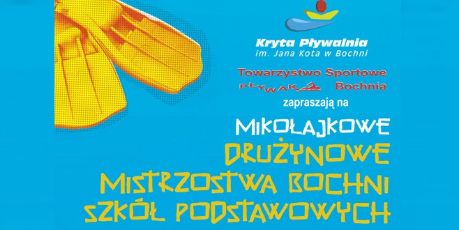 W najbliższą sobotę bocheńska pływalnia zaprasza do kibicowania 5 zespołom z bocheńskich szkół podstawowych, które wystartują w II Mikołajkowych Drużynowych Mistrzostwach Bochni o Złotą Srebrną i Brązową Płetwę. Początek zawodów o godzinie 15.00.