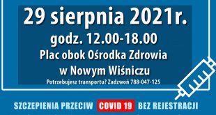 Na terenie Gminy Nowy Wiśnicz już po raz kolejny uruchomione zostaną Mobilne Punkty Szczepień przeciw Covid-19. Tym razem w sobotę, 28 sierpnia 2021r., w godz. 14.00-19.00 przy Świetlicy Wiejskiej w Kopalinach oraz w niedzielę, 29 sierpnia 2021r. w godz. 12.00-.18.00 na placu obok Ośrodka Zdrowia w Nowym Wiśniczu. W mobilnych punktach będzie możliwość zaszczepienia się jednodawkową szczepionką Johnson&Johnson, bez wcześniejszej ...