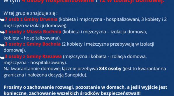 Z informacji przesłanych przez Powiatową Stację Sanitarno-Epidemiologiczną w Bochni, na dzień dzisiejszy (02.04) na terenie powiatu bocheńskiego rozpoznanych zostało 16 przypadków zakażenia koronawirusem SARS-CoV-2, potwierdzonych badaniami laboratoryjnymi, w tym 4 osoby hospitalizowane i 12 w izolacji domowej.