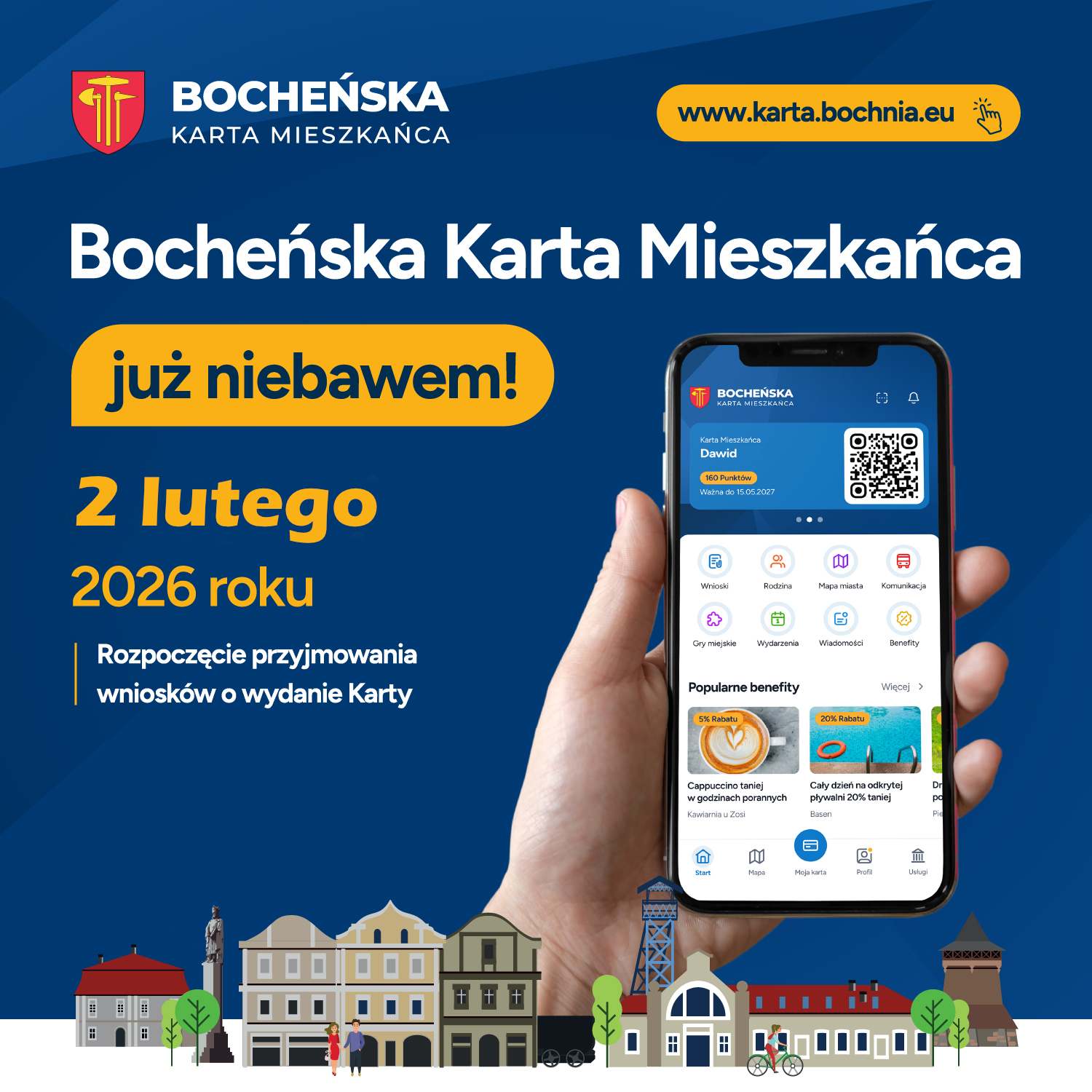 Od 2 lutego 2026 r. Miasto Bochnia uruchamia Program Bocheńska Karta Mieszkańca, rozpoczynając jednocześnie przyjmowanie wniosków od mieszkańców. Program skierowany jest do osób zamieszkujących na terenie Miasta Bochnia i stanowi nowoczesne, długofalowe narzędzie wsparcia lokalnej społeczności.