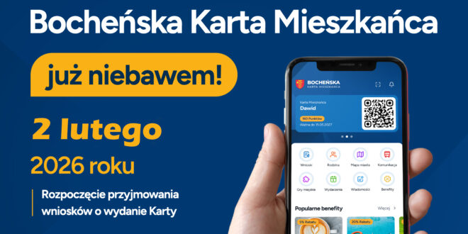Od 2 lutego 2026 r. Miasto Bochnia uruchamia Program Bocheńska Karta Mieszkańca, rozpoczynając jednocześnie przyjmowanie wniosków od mieszkańców. Program skierowany jest do osób zamieszkujących na terenie Miasta Bochnia i stanowi nowoczesne, długofalowe narzędzie wsparcia lokalnej społeczności.