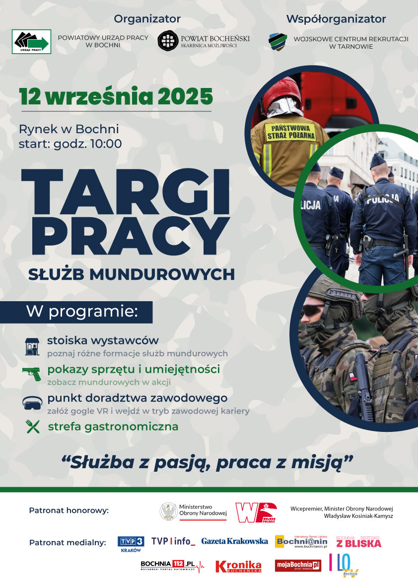 Powiatowy Urząd Pracy w Bochni wraz z Powiatem Bocheńskim zapraszają na Targi Pracy Służb Mundurowych, które odbędą się 12 września na Rynku w Bochni. To niepowtarzalna okazja, aby z poznać możliwości pracy w formacjach, dla których mundur jest symbolem odwagi, odpowiedzialności i codziennej służby na rzecz drugiego człowieka.