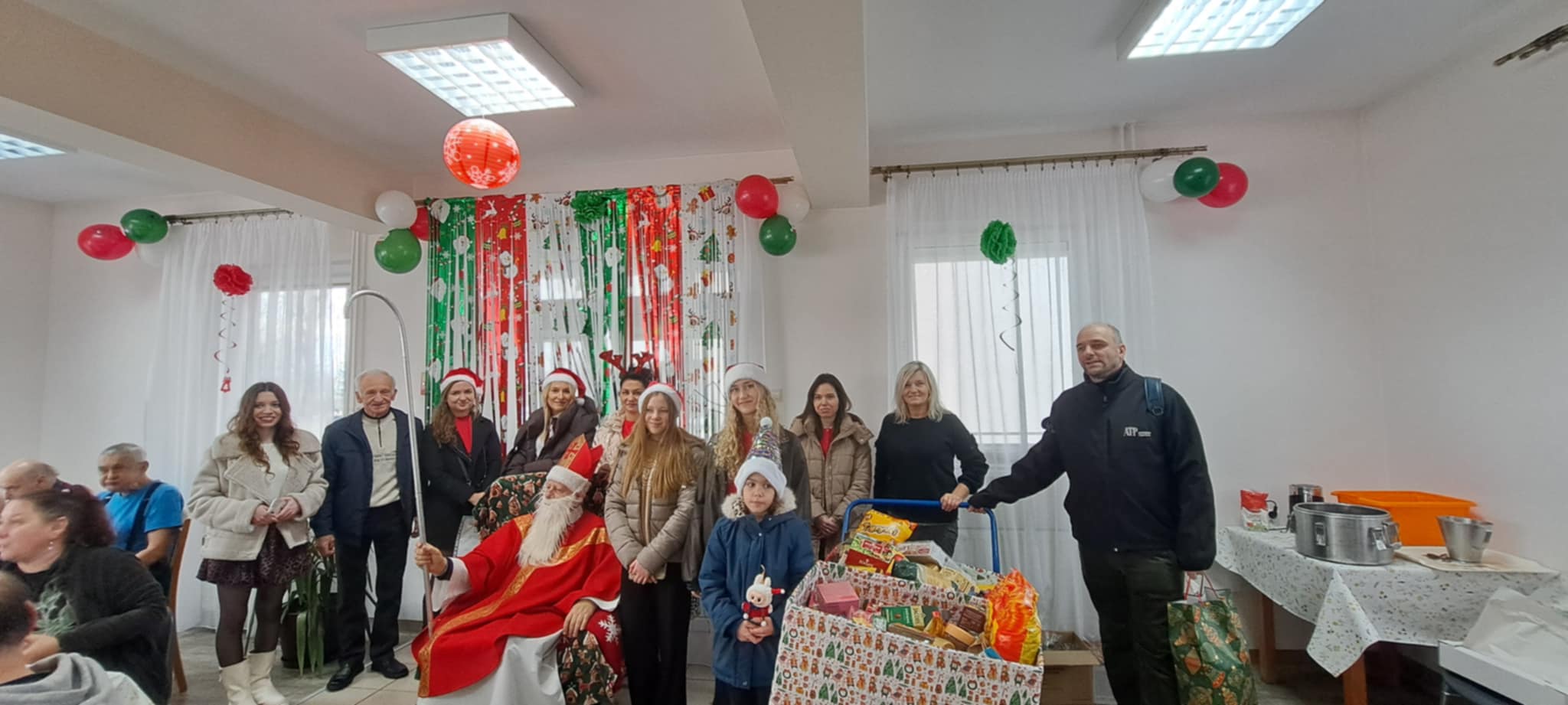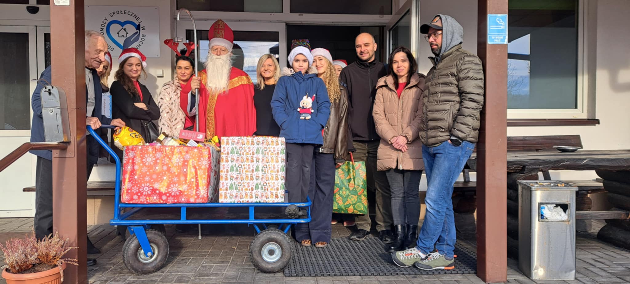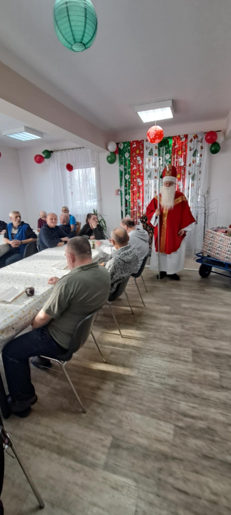 Podopieczni DPS przygotowali specjalne miejsce dla św. Mikołaja z dalekiego kraju i poczęstunek. Były wierszyki i rysunki podarowane przez przebywających tam pacjentów. Poczęstunek dla wszystkich przybyłych, przywitanie i pomoc logistyczna przez Magdalenę Szewczyk. Na sam koniec wszyscy machali przez okna z uśmiechem. Tego roku został przekazany czek na zakup przewijaków dla niemowląt. Nie byłoby czeku, gdyby nie kawiarenka kl. 3 ze Szkoły Podstawowej nr 1 w Bochni. Dar serca dzieci komunijnych oraz wiele prezentów zgromadzonych w sklepach Supermarket ColdLux 1, 2, 3 i życzliwości P. Włodzimierzowi i Bogdanowi Chwastek.