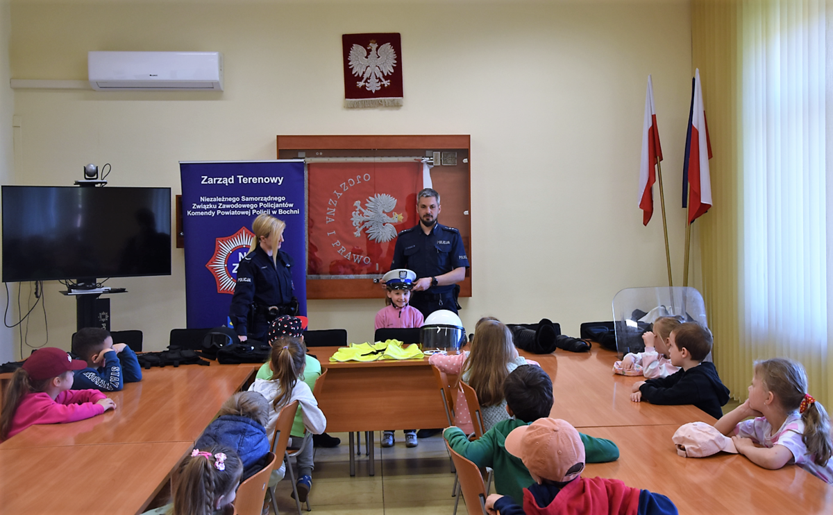 W środę (23 kwietnia br.) w godzinach porannych w Komendzie Powiatowej Policji w Bochni wraz ze swoimi wychowawcami pojawili się uczniowie zerówki ze Szkoły Podstawowej nr 5 w Bochni. Dzieci wzięły udział w prelekcji, którą przygotowali funkcjonariusze Zespołu ds. Nieletnich. Mundurowi opowiedzieli swoim słuchaczom o podstawowych zasadach ruchu drogowego oraz przypomnieli im, w jaki sposób prawidłowo korzystać z numeru alarmowego 112.