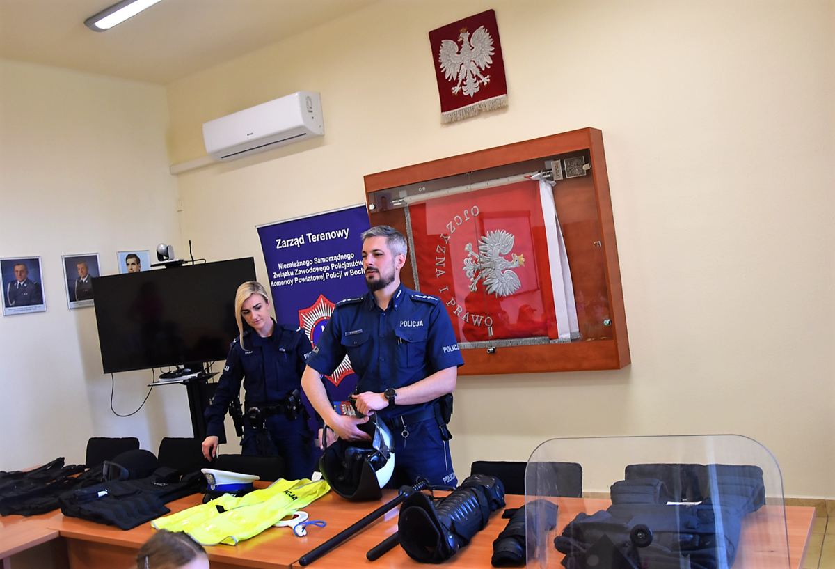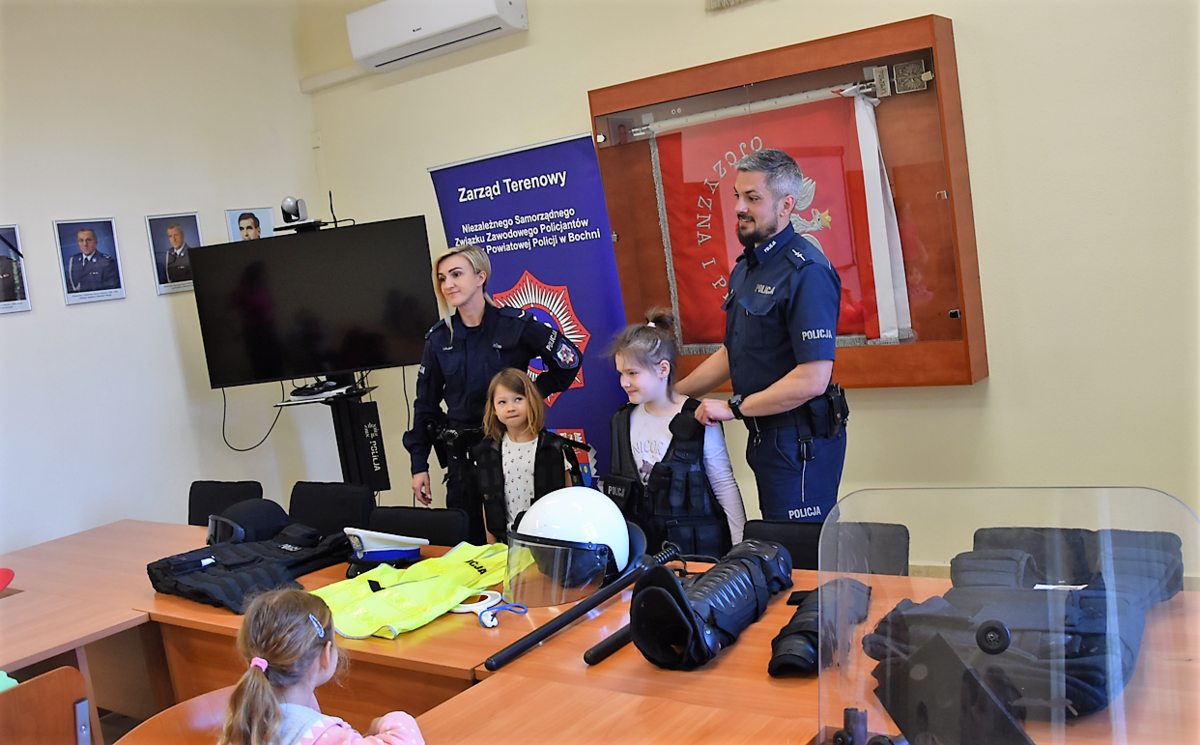 Podczas spotkania mundurowi zaprezentowali im pokaz policyjnego sprzętu i umundurowania, a także opowiedzieli o swojej codziennej służbie. Każde z dzieci mogło przymierzyć policyjne kamizelki oraz kask. Druga część spotkania została przeniesiona na policyjny parking, gdzie na uczniów czekały dwa policyjne, oznakowane radiowozy. Uruchomione sygnały świetlne oraz możliwość sprawdzenia policyjnego pojazdu od środka były dla dzieci ogromną atrakcją. Spotkanie zakończyło się pamiątkowym zdjęciem.