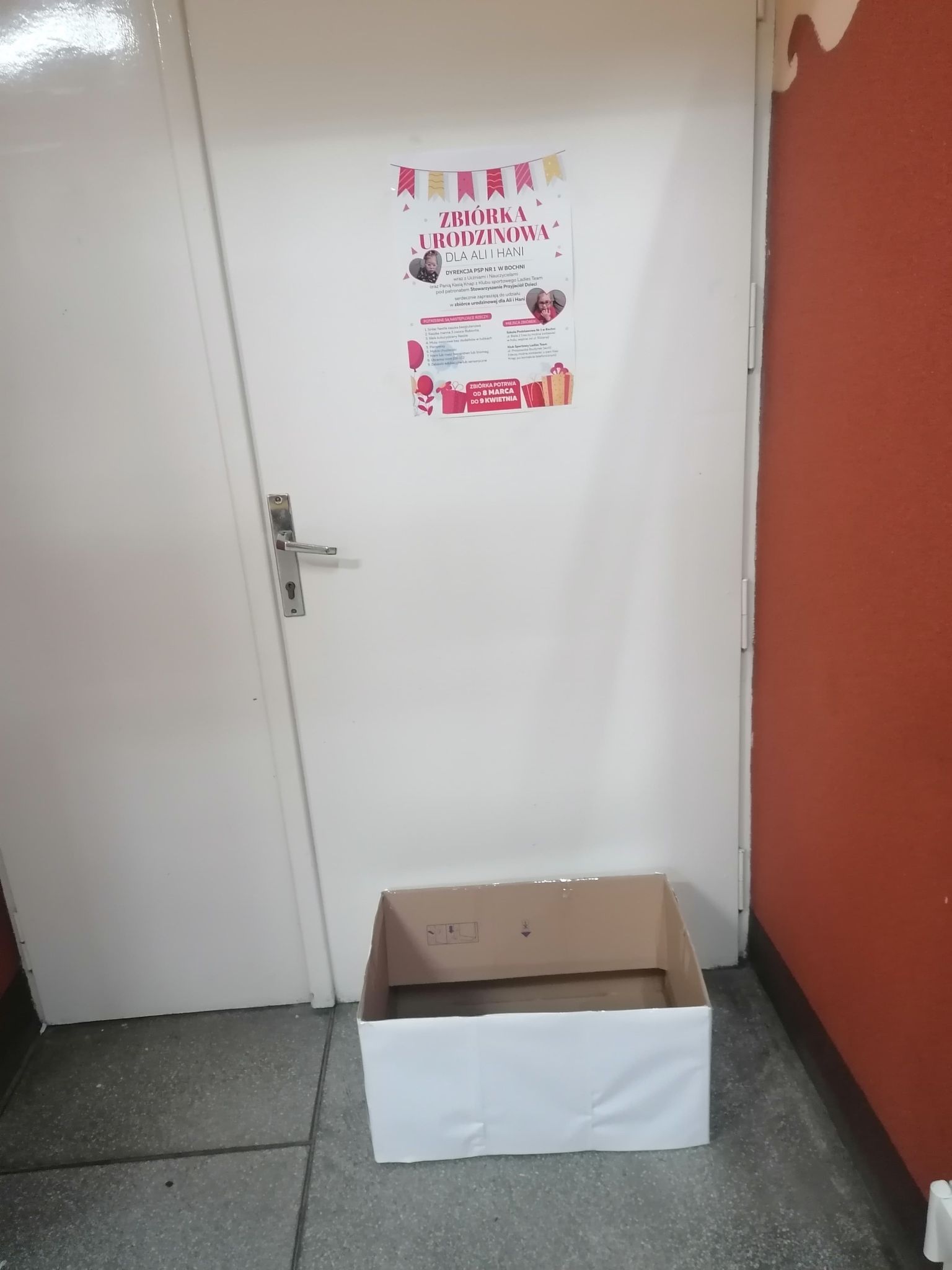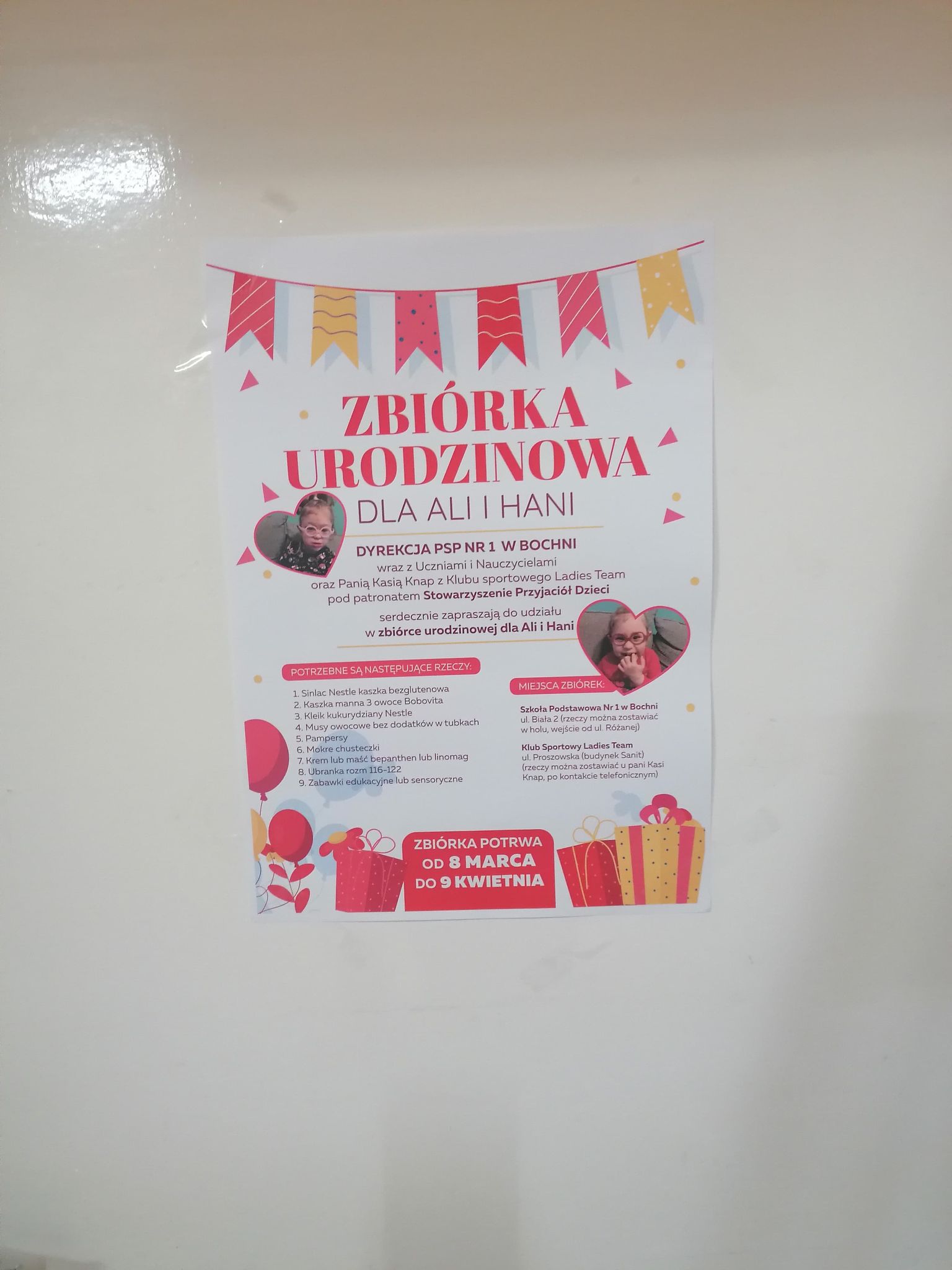 Będą zbierane takie rzeczy jak kaszki, kleiki, środki higieniczne, ubranka, zabawki. Rzeczy te można zostawiać w holu szkoły, gdzie stoi pudełko przy wejściu na salę gimnastyczną. Drugim miejscem zbiórki jest klub sportowy Ladies Team w Bochni, gdzie rzeczy można pozostawić u Kasi Knap w siłowni.