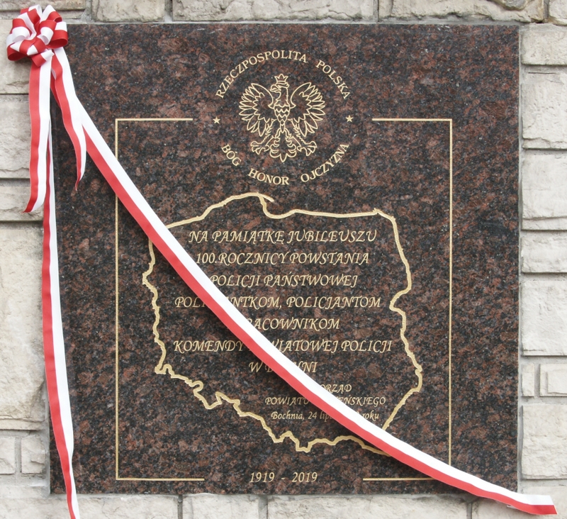 Fundatorem tablicy jest samorząd powiatu bocheńskiego, którego członkowie w ten sposób uczcili jubileusz 100-lecia Policji Państwowej. Jest to również wyraz wzorowej współpracy samorządu lokalnego z bocheńską Policją w trosce o bezpieczeństwo mieszkańców powiatu bocheńskiego i przebywających na jego terenie gości. Dzisiejsza uroczystość wpisuje się w program powiatowych obchodów Święta Policji, których główna część odbędzie się w dniu 25 lipca 2019 roku, o godzinie 10.00 na Sali balowej Zamku w Nowym Wiśniczu.