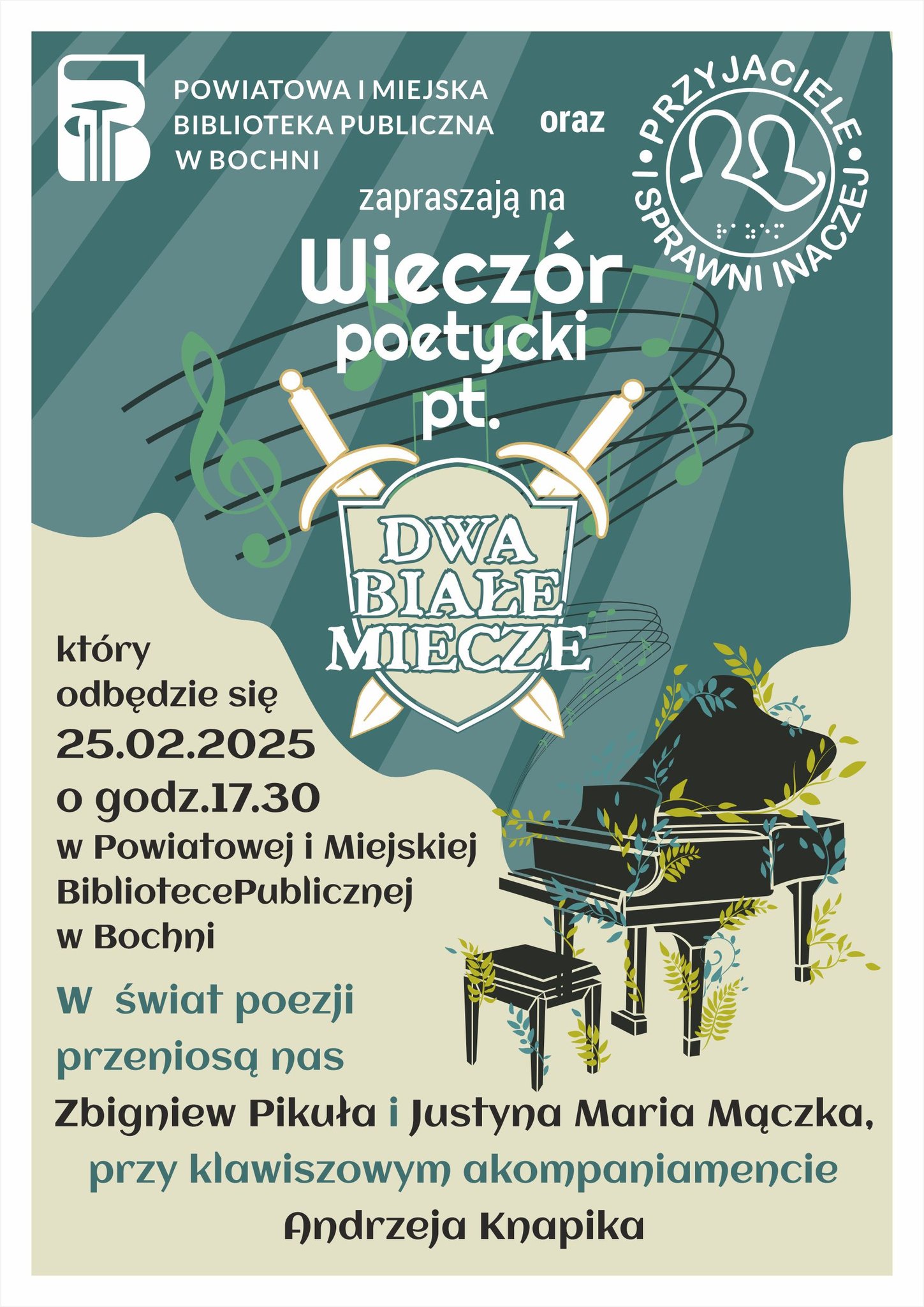 We wtorkowy wieczór grupa Przyjaciele i Sprawni Inaczej wraz z Biblioteką zapraszają na Wieczór poetycki „Dwa białe miecze”, 25 lutego 2025 r., godz. 17,30, sala klubu Biblioteki.