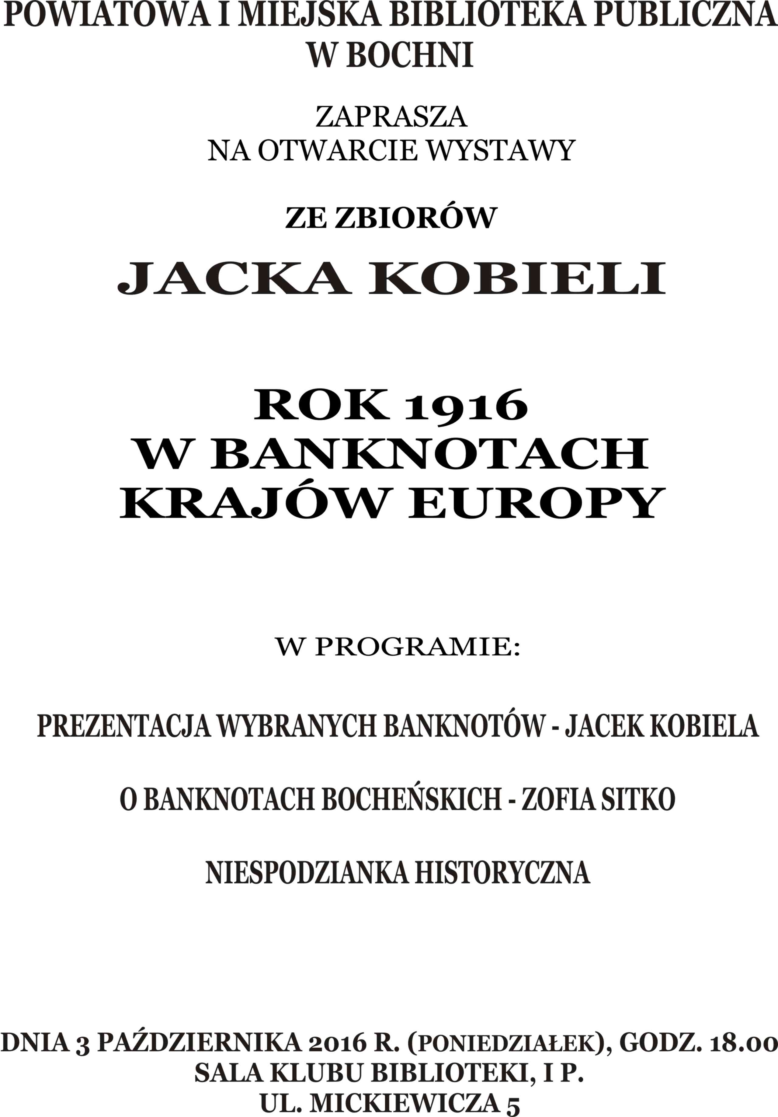 Powiatowa i Miejska biblioteka Publiczna w Bochni zaprasza na otwarcie wystawy przygotowanej ze zbiorów Jacka Kobieli „Rok 1916 w banknotach krajów Europy” – 3 października 2016 r. (poniedziałek), godz. 18.00 w sali klubu Biblioteki.