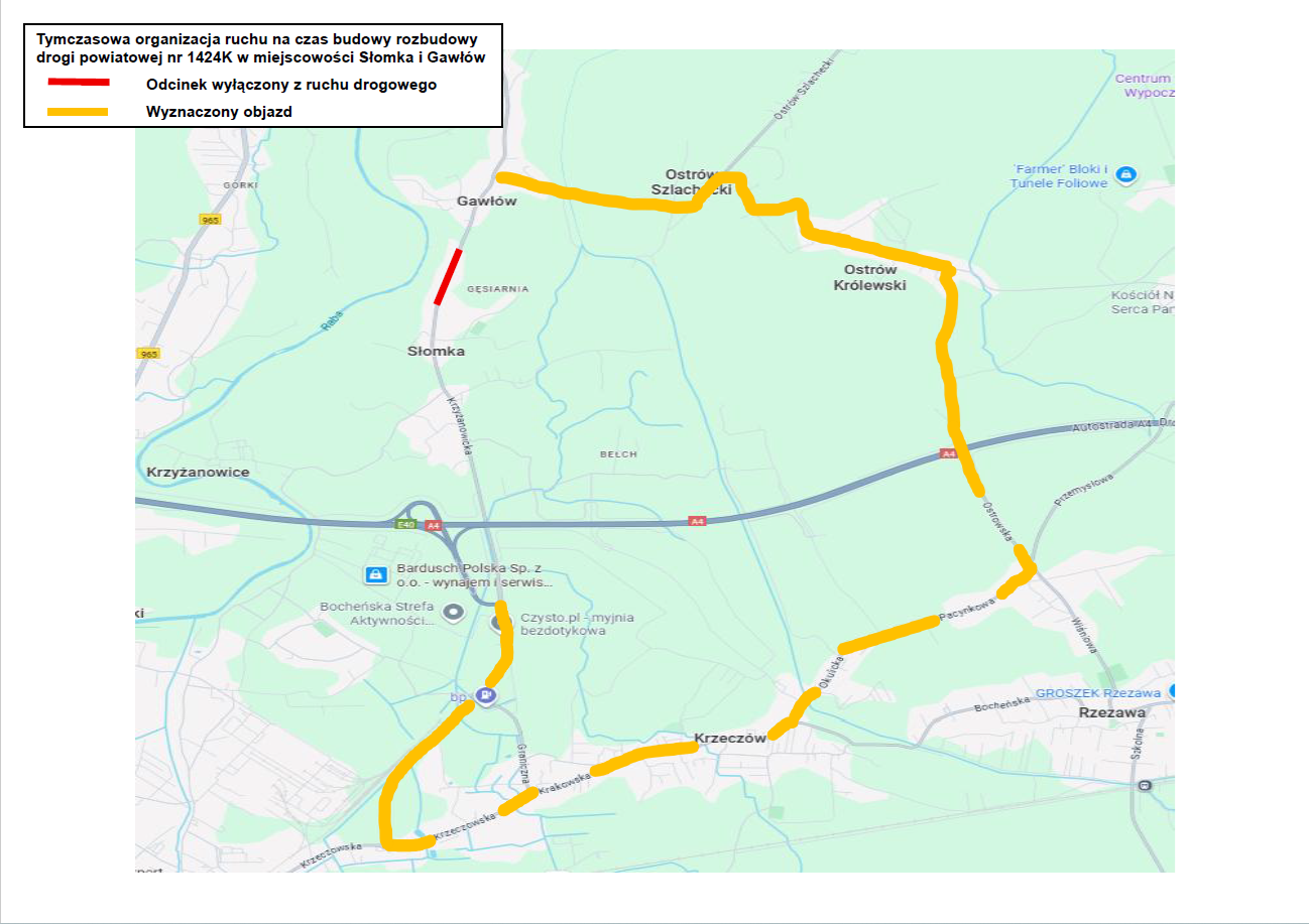 Powiatowy Zarząd Dróg w Bochni informuje, że w związku z prowadzonymi pracami przy rozbudowie drogi powiatowej w Gawłowie, nastąpi całkowite zamknięcie drogi dla ruchu na odcinku od cmentarza (od posesji nr 133) w kierunku Bochni (do posesji nr 127). Zamknięty fragment ma długość około 400 metrów. Utrudnienia potrwają od 30 października do 6 listopada 2025 r.