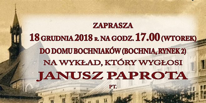 Stowarzyszenie Bochniaków i Miłośników Ziemi Bocheńskiej zaprasza na wykład Janusza Paproty do Domu Bochniaków we wtorek 18 grudnia 2018 r, na godz. 17.00.