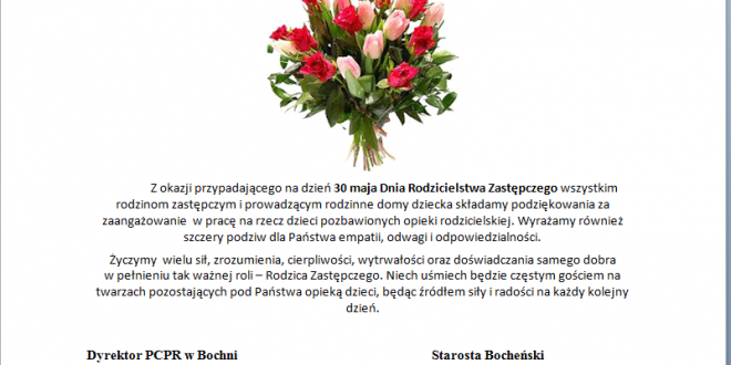 Z okazji przypadającego na dzień 30 maja Dnia Rodzicielstwa Zastępczego wszystkim rodzinom zastępczym i prowadzącym rodzinne domy dziecka Starostwo Powiatowe oraz dyrektor Powiatowego Centrum Pomocy Społecznej w Bochni składają podziękowania za zaangażowanie w pracę na rzecz dzieci pozbawionych opieki rodzicielskiej. Wyraża również szczery podziw dla Państwa empatii, odwagi i odpowiedzialności.